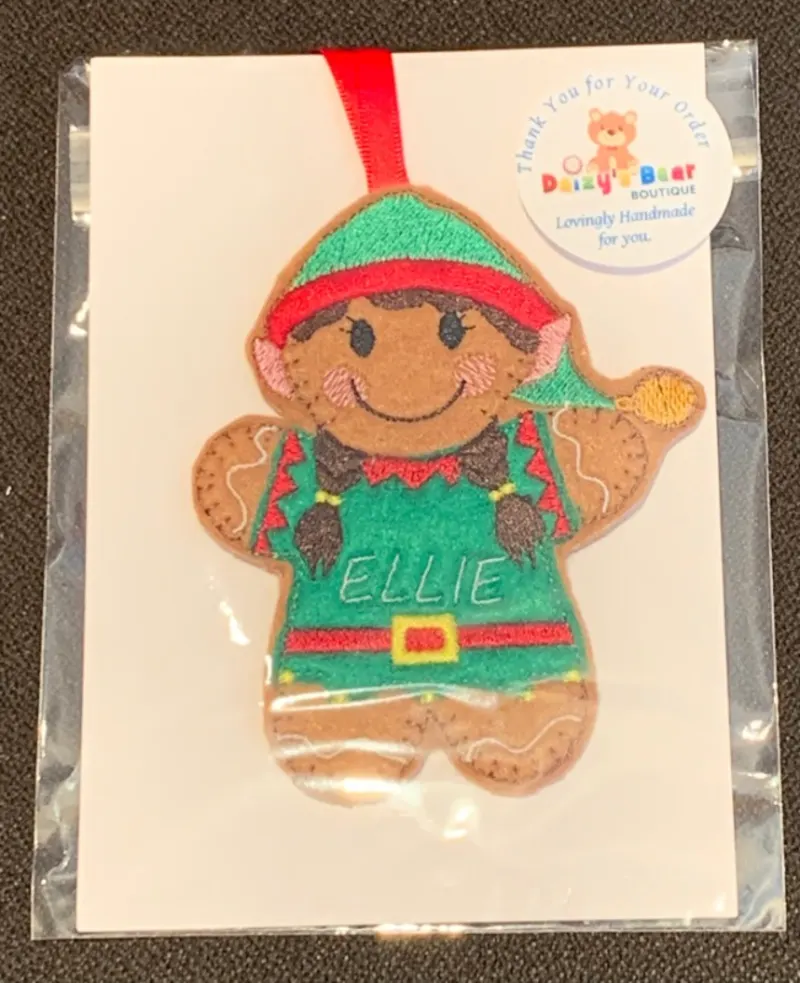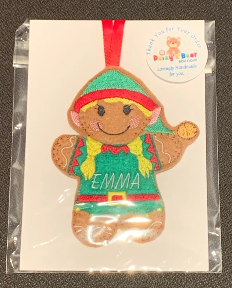 Christmas Elf lovingly handcrafted and detailed just for you. This Ginger is 4" in length from head to toe plus the hanging ribbon loop. Made from polyester felt she will last year after year. When placing an order just let us know the name or date that you would like embroidered on your Gingerbread Elf. Traditionally she is green and red but of course we can change these colour too if it would make it extra special for you.