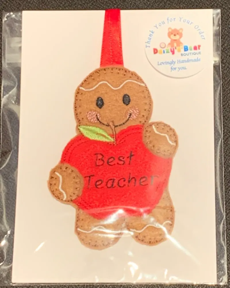 Christmas Thank You Teacher lovingly handcrafted and detailed just for you. This Ginger is approx. 4" in length from head to toe plus the hanging ribbon loop. Made from polyester felt s/he will last year after year. When placing an order just let us know the name or date that you would like embroidered on your Gingerbread Thank You Teacher. This could be as simple as 'Thank You' or to make it more personal, how about the Teacher or Teachers Assistants name? We can also make the apple red or green or any other colour that would make it personal for you.